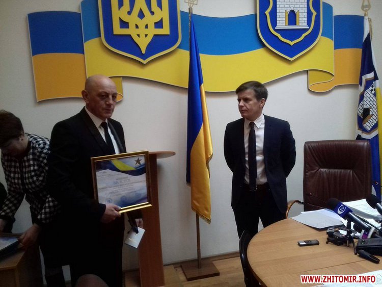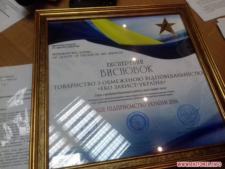 На початку чергового засідання виконавчого комітету Житомирської міської ради 22 грудня мер Сергій Сухомлин вручив відзнаки Національного рейтингу товарів і послуг «Зірка якості» представникам ТОВ «Еко Захист-Україна», яке за офіційними даними Державної статистики цьогоріч отримало статус «Краще підприємство країни 2016 року». На засіданні присутні 17 членів виконавчого комітету з 25.