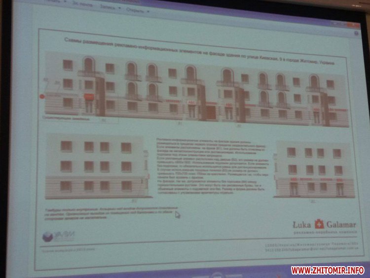 «Вам був представлений проект рішення про затвердження архітектурно-художньої концепції зовнішнього вигляду вулиць і територій міста Житомира. Вона дійсно розроблялася, перероблялася, доопрацьовувалась два роки. Спочатку вона започатковувалася як не нормативно-правовий акт, а рекомендаційного характеру документ. Була створена група, яка працювала з цією концепцією. Вона була оприлюднена. Два рази вносився на розгляд виконавчого комітету і потім один раз вносився на розгляд сесії місткої ради, на затвердження. І тоді була пропозиція перевірити, чи підлягає документ все ж таки як регуляторний акт. Ми зробили його регулярним актом, пройшли всю процедуру, з цим пов’язану. Пройшли громадські слухання. І він уже оприлюднений ну майже півтора року. В складі цієї концепції є два порядки: порядок розміщення інформаційних засобів і порядок погодження паспортів опорядження фасадів. Для нас це дуже суттєве доповнення, тому що це дозволяє, по-перше, впорядковувати самі фасади, а по-друге, це дає можливість суб’єктам господарювання на кожну вивіску, на кожен інформаційний засіб декларувати, реєструвати свій документ, що вони відповідають архітектурно-художній концепції», – пояснила заступник директора департаменту містобудування та земельних відносин міської ради, начальник управління регулювання забудови міста – головний архітектор міста Євгенія Черкасова.