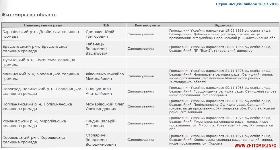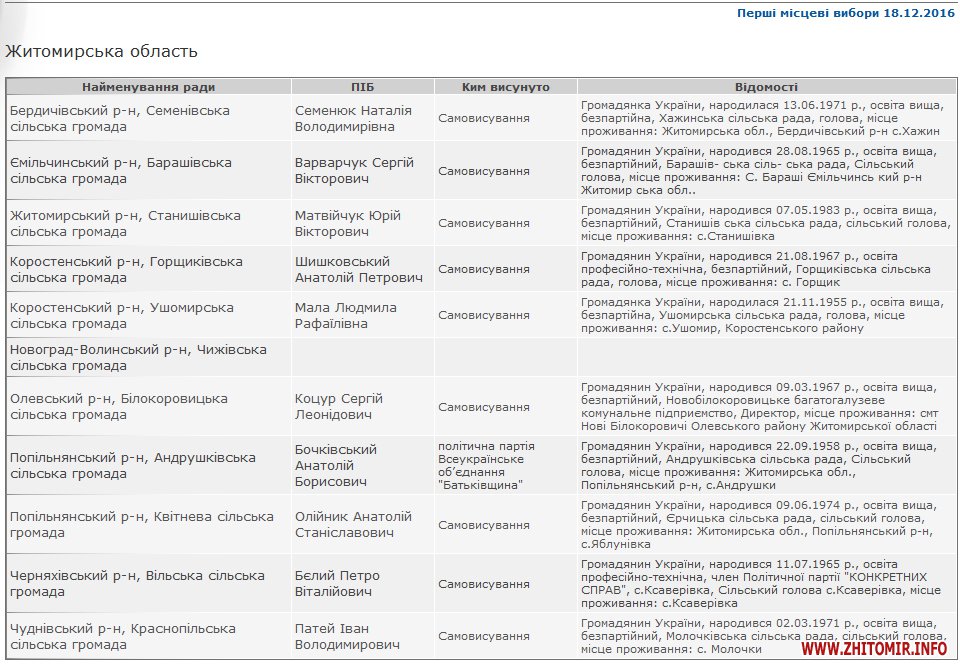 Станом на 12.00 год. 23 грудня на сайті Центрвиборчкому опубліковані результати виборів голів у 18 з 22 ОТГ Житомирської області.