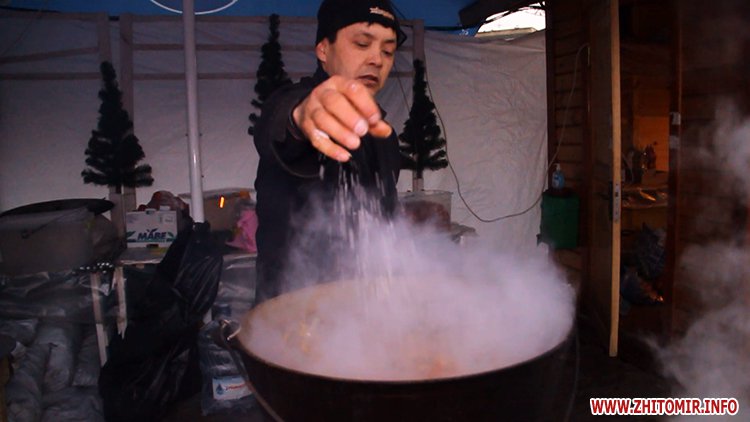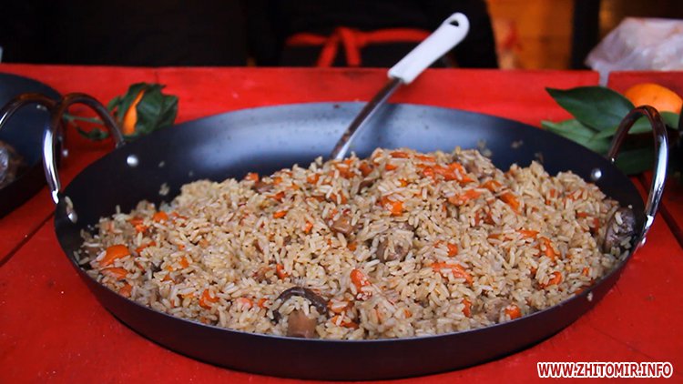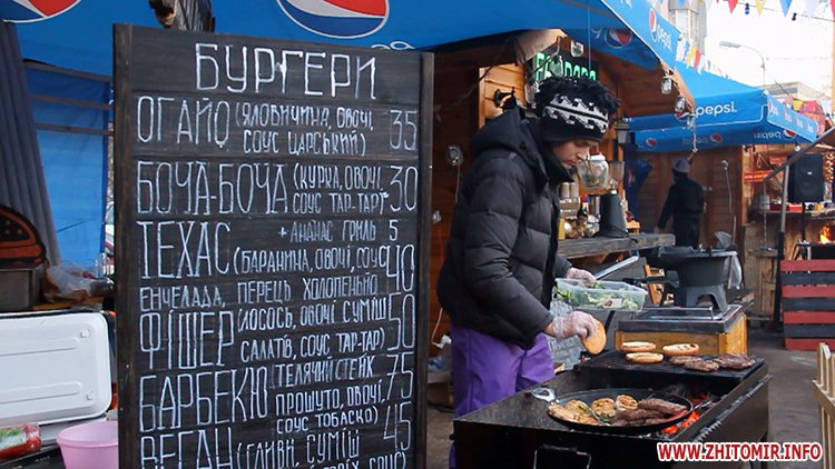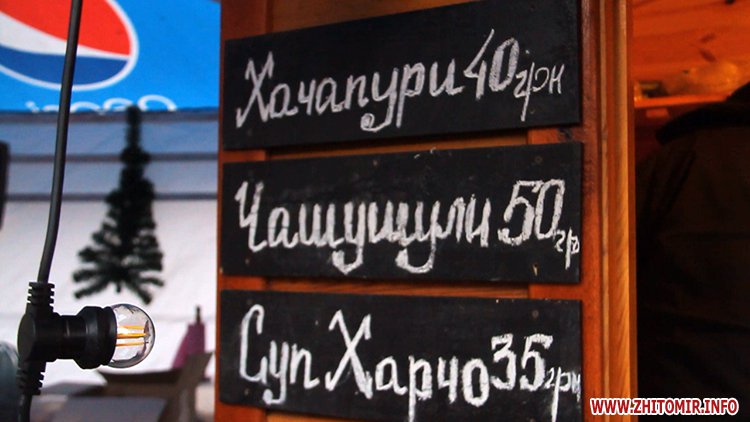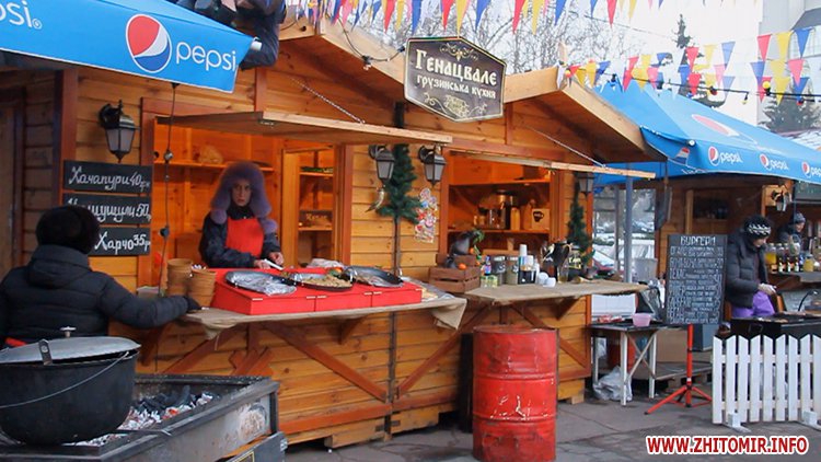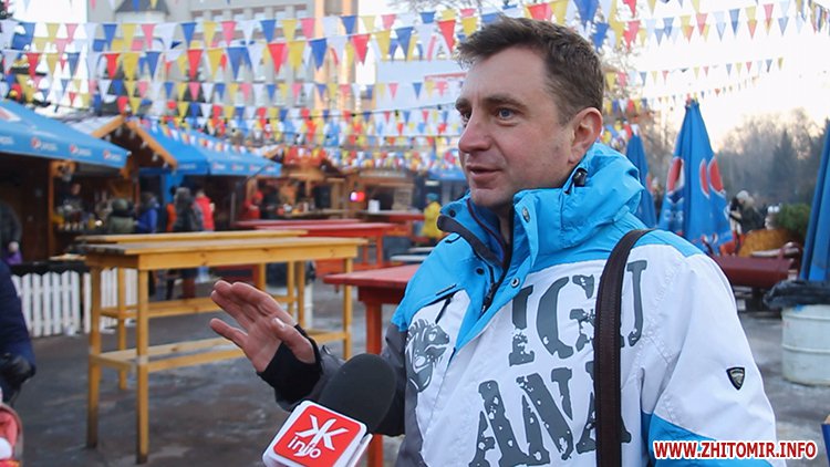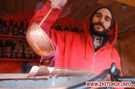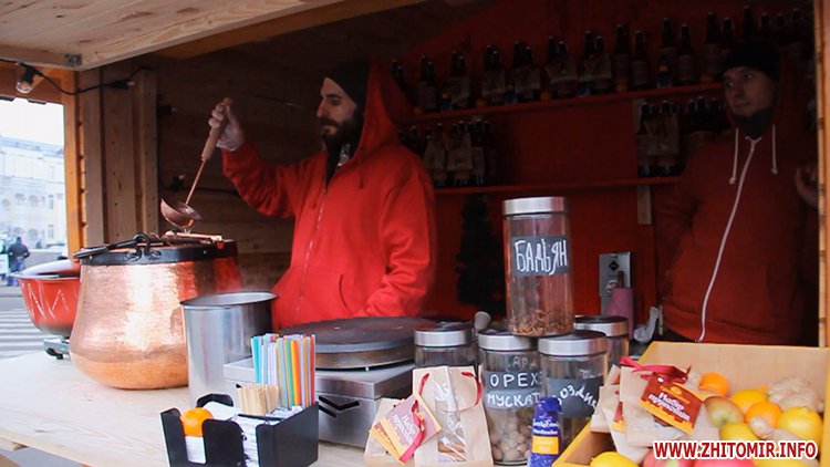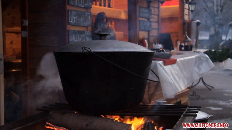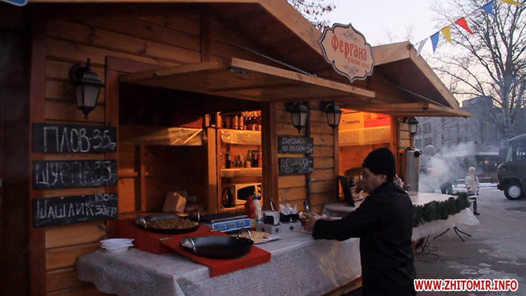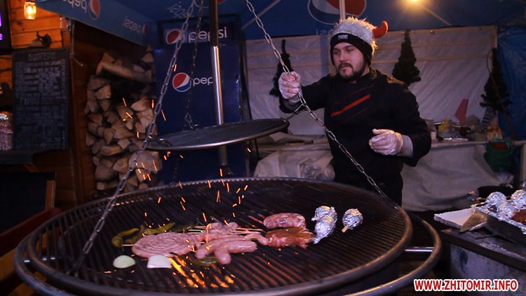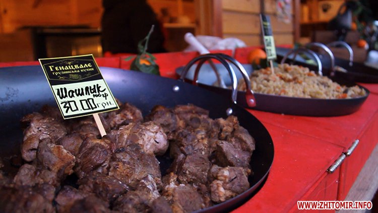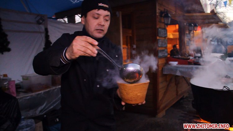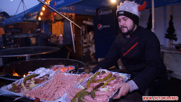 «Насправді, ми дуже ретельно і довго готувались до цього свята. На цьому фудкорті, ми представляємо сім ресторанів. «Фергана» - у нас там є шеф-кухар узбецької кухні, його звуть Бахтіор. Він дійсно із Фергани. Досить класний робить плов, дуже смачний і декілька м’ясних страв, які дійсно здивують житомирян своєю смакотою та витонченістю. Друга наша локація це – «Спотикач». Житомиряни бачили його у минулому році на Різдвяному ярмарку, як завжди він буде радувати всіх смачними ковбасками, смачним глінтвейном, медовухою. Ще одна концепція у нас є - це «Генацвалє». Два грузини Бадрі та Гіві дуже старалися, привезли обладнання для того, щоб робити справжні хачапурі з сулугуні, тому можна спробувати. Оскільки зараз піст, кожного дня вони готують смачний плов з грибами, без м’яса, тому можна прийти покуштувати. Є декілька страв, чашушулі смачний і сьогодні вони приготували для житомирян суп харчо. Дуже смачна у них є наливочка, називається кальвадос і глінтвейн, які вони варять тут же на вогні, в казанах. На нашому фестивалі також є відомий «Fat Papa» - це смачні бургери. Цього року вони також готують булочки та котлети на справжньому вогні, на грилі, тому дуже смачні сендвічі. Також, у нас є «Шаурма», де Джозеф класно готує. Він сам з Близького Сходу, з Палестини, він на цьому знається. Найкраща шаурма в Житомирі - це у нього. Окраса нашого фудкорту - це «Глінтвейня». Якщо ви бачите, у нас є мідний великий чан, ми його спеціально замовили з Португалії, хлопці у нас готують дуже смачний глінтвейн. Декілька видів є, ви можете побачити там справжні спеції. Це гвоздика, кориця, кардамон, мускатний горіх, духмяний перець і є декілька дуже смачних пуншів. Ми в цьому році не піднімали ціни, у нас глінтвейн, на приклад коштує 15 грн маленький стаканчик, 25 грн великий. Це ті ж самі ціни, що і в тому році. Не хотіли підіймати, бо хочемо, щоб новорічні свята, новорічні страви і напої були доступними. Тому всіх запрошуємо, ціни доступні», - розповів Ярослав Гапоненко.