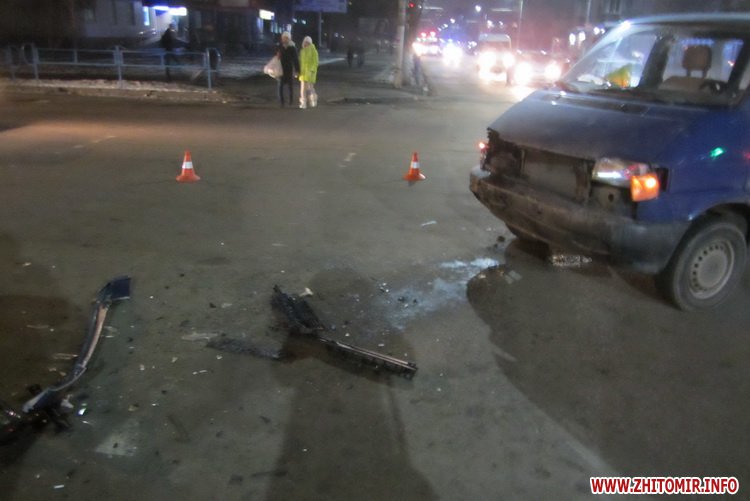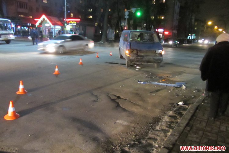 Как сообщал Житомир.info, вечером 23 декабря на перекрестке Большой Бердичевской и Театральной столкнулись микроавтобус Volkswagen и Lada.