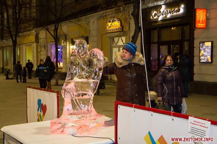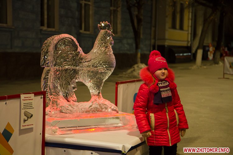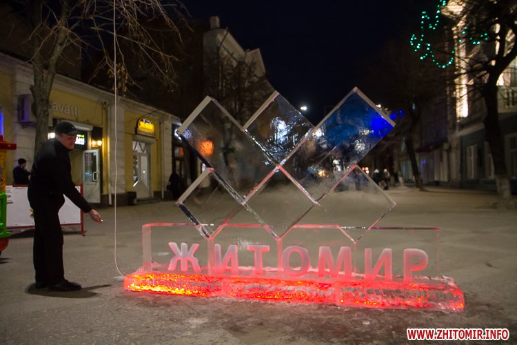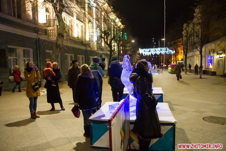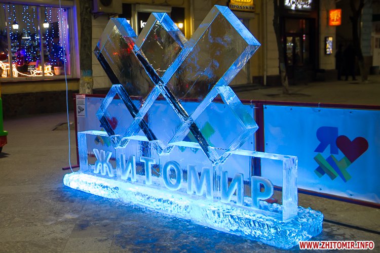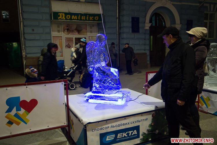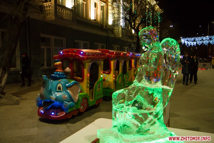 Увечері 30 грудня на Різдвяному ярмарку в Житомирі відкрили та урочисто запалили льодові скульптури. Їх розмістили на вулиці Михайлівській недалеко від мерії.