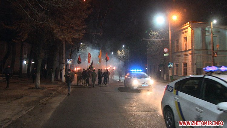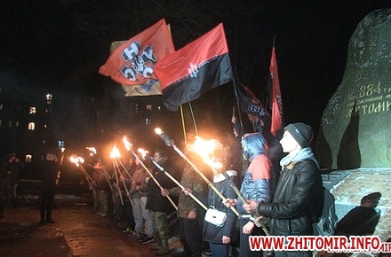 У Житомирі 1 січня близько сотні людей пройшли маршем зі смолоскипами центральними вулицями міста. Таким чином житомирські націоналісти відзначили 108-му річницю з дня народження провідника Організації українських націоналістів Степана Бандери. Люди тримали в руках червоно-чорні прапори Правого сектору та прапори УНА-УНСО. Учасників ходи супроводжували одразу шість поліцейських автівок та кілька десятків правоохоронців і військовослужбовців Національної гвардії.