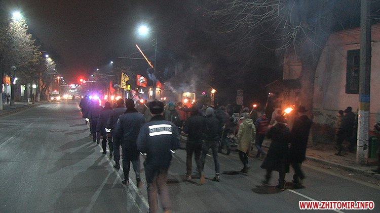 Вигукуючи націоналістичні гасла учасники смолоскипної ходи пройшли вулицею Великою Бердичівською до Замкової гори. Біля каменю на честь заснування Житомира вони провели імпровізоване віче, вшанували «хвилиною мовчання» пам'ять Степана Бандери та закінчили акцію спільним виконанням державного гімну України.