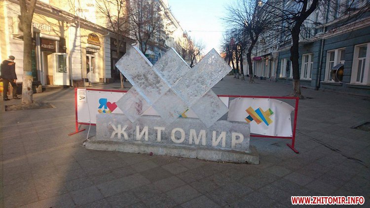 Крім того, невідомі пробили дірку в пластиковому логотипі "Я люблю Житомир!" на майдані Корольова .