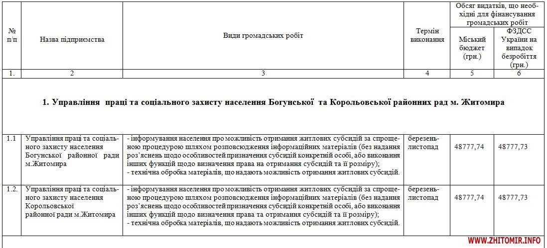 У переліку – чотири види робіт: інформування населення про можливість отримання житлових субсидій; технічна обробка матеріалів на отримання субсидій; упорядкування могил та пам’ятників; послуг з супроводу інвалідів по зору 1 групи. На фінансування громадських робіт планують витратити 146 тис. 939,32 грн з міського бюджету і стільки ж коштів Фонду загальнообов’язкового державного соціального страхування на випадок безробіття.
