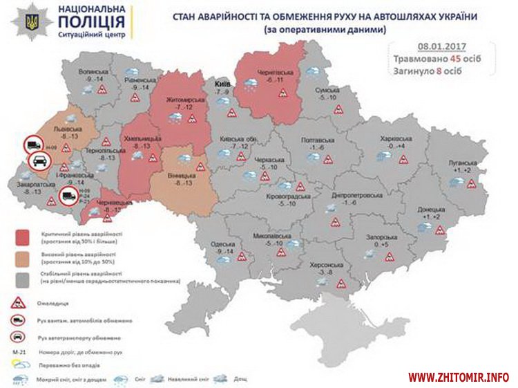 «За минулу добу у результаті ускладнених погодних умов та підвищеної аварійної ситуації на автошляхах України загинули вісім та травмовані 45 громадян. Критична за рівнем аварійності ситуація у Чернівецькій, Хмельницькій, Житомирській та Чернігівській областях. Складною продовжує лишатися ситуація на дорогах Львівщини та Вінниччини», - інформує Нацполіція.