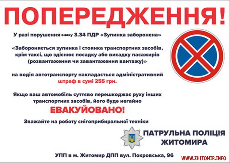 Варто зазначити, що житомирська патрульна поліція розробила шаблон звернення до водіїв з проханням не заважати роботі снігоприбиральної техніки і не паркуватися на узбіччях: