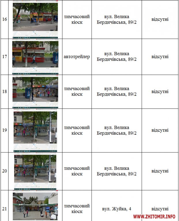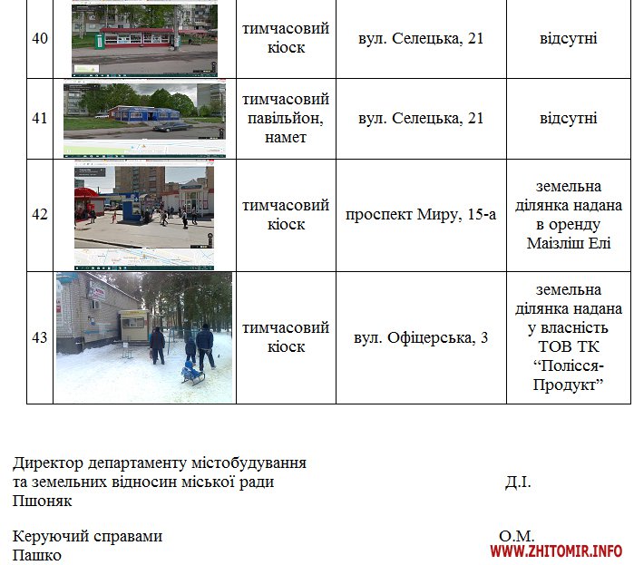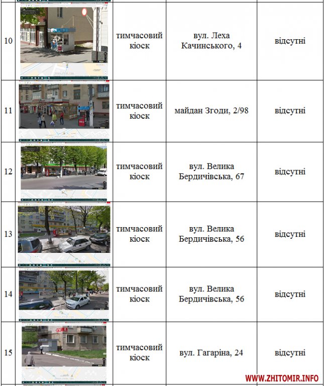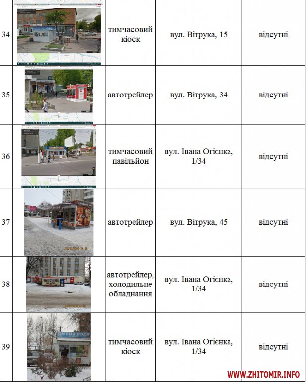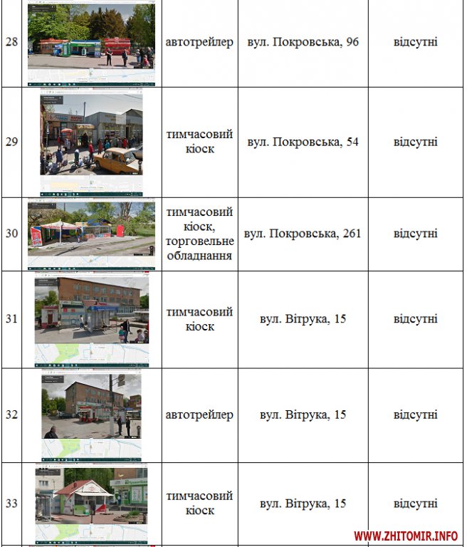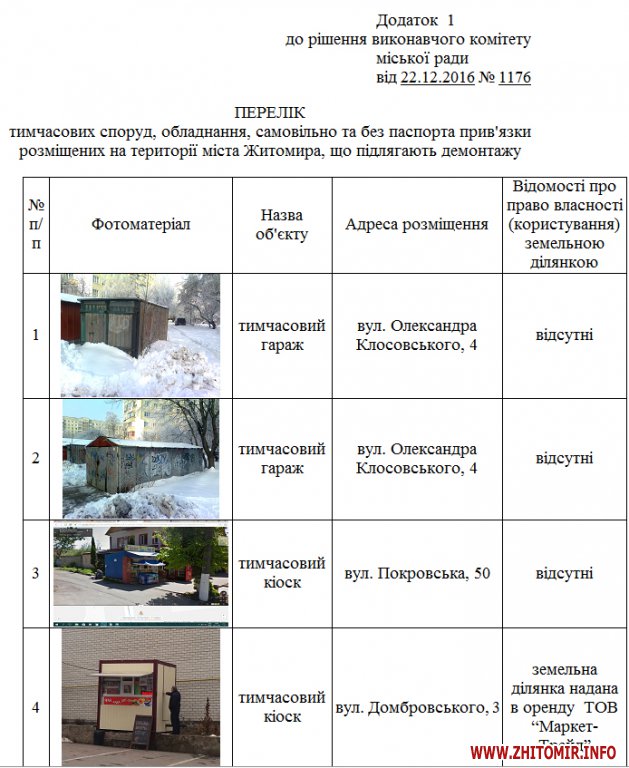 У додатку 1 до рішення виконкому від 22 грудня є перелік з 43 об’єктів, які розміщених самовільно та без паспорта прив'язки: кіоски, гаражі та автотрейлери.