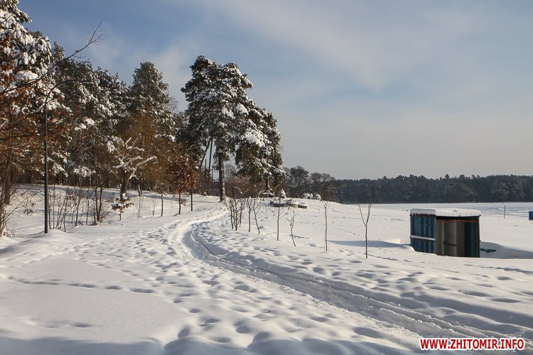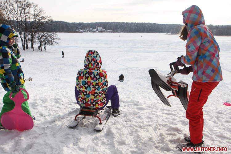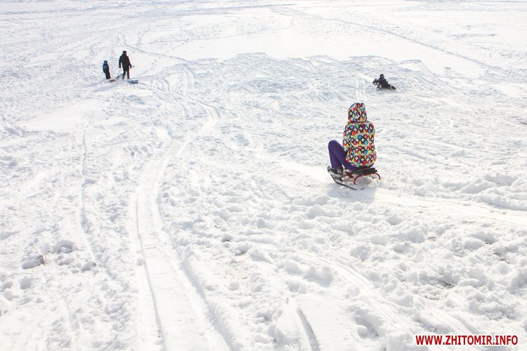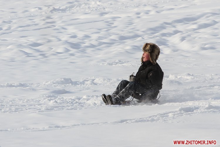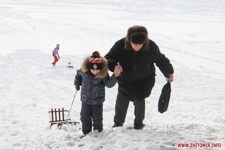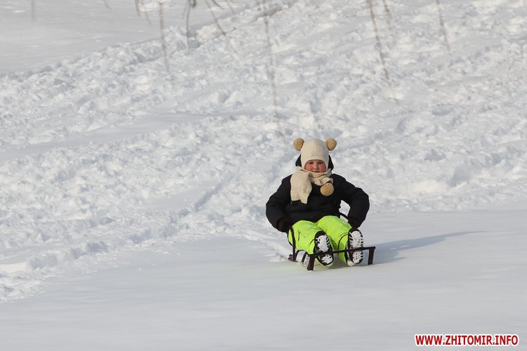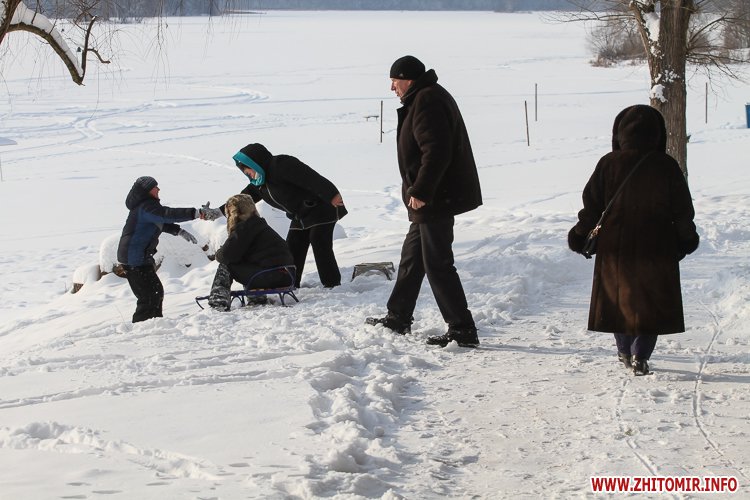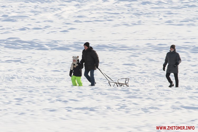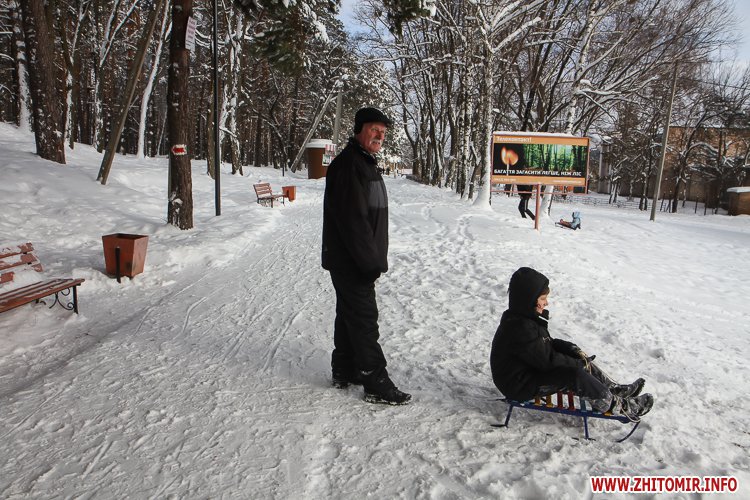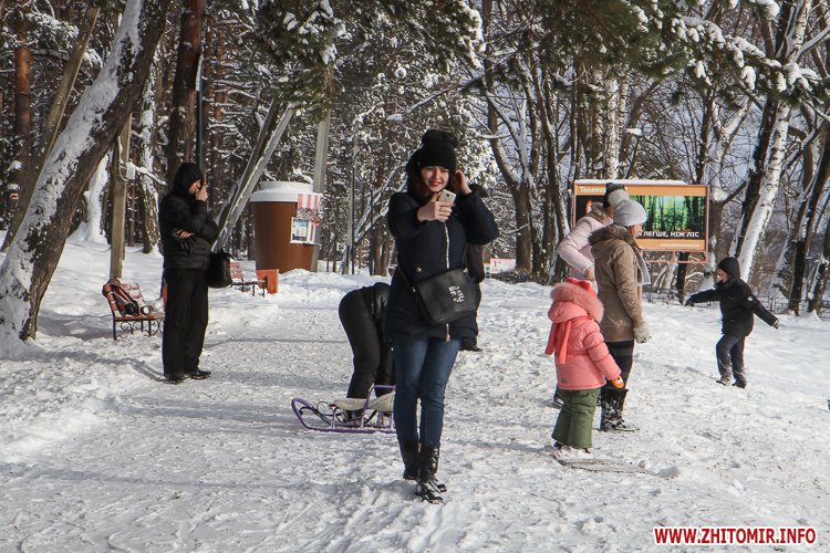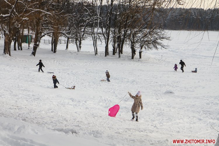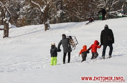 Після рясного снігопаду 12 січня у Житомирі засвітило сонце, і городяни разом з дітьми вийшли у гідропарк. Школярі насолоджуються останніми днями канікул (на навчання їм – 16 січня), мороз неміцний, тому з’їжджати на санках і пірнати у сніг весело.
