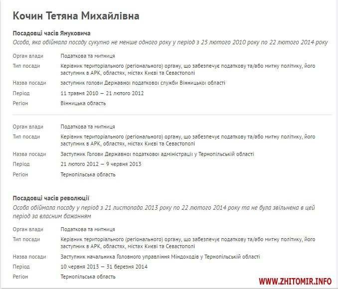 У свою чергу представник відповідача – ГУ ДФС у Житомирській області – зауважив, що Тетяна Кочин займала посаду заступника голови Державної податкової служби в Тернопільській області, тобто, безпосереднього керівника територіального органу центрального органу виконавчої влади, що забезпечує формування та реалізацію державної податкової політики.