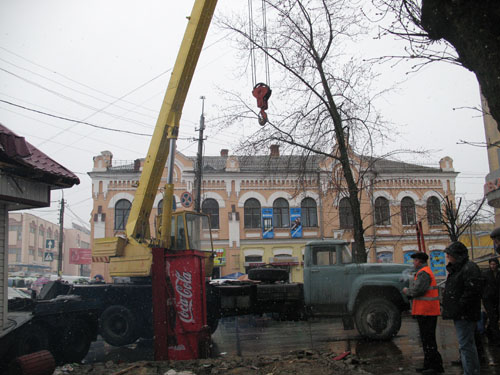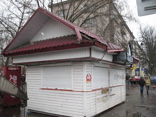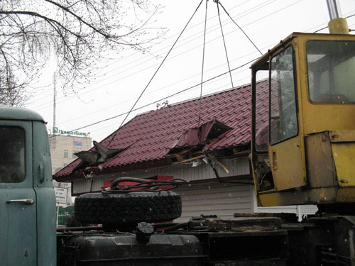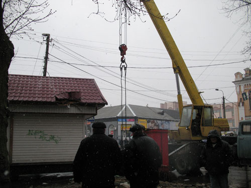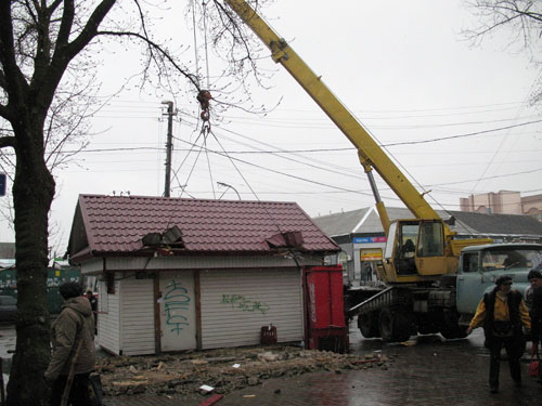 Сегодня с утра на пересечении улиц Хлебной и Гоголевской власти Житомира демонтировали хлебный киоск. По словам заместителя мэра Игоря Гундича в течении последних трех лет торговля на этом хлебном месте осуществлялась без каких-либо разрешений. Именно три года назад мэрия Житомира не продлила разрешительные документы владельцу киоска, который занимался продажей хлеба. После этого начался длительный судебный процесс, по словам Гундича, хоть мэрия все суды и выиграла, частный предприниматель не спешил убирать свою торговую точку. После того как прокуратура неоднократно напомнила Житомирским властям о необходимости исполнить свое же решение и запретить торговлю, власти решили «непослушный» киоск демонтировать. Он будет храниться на штрафплощадке, пока владелец не заберет его.