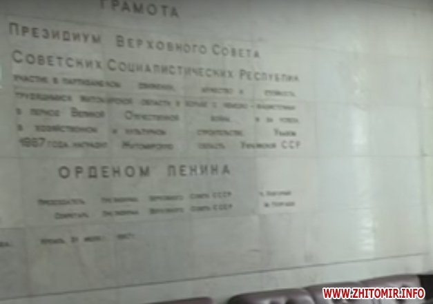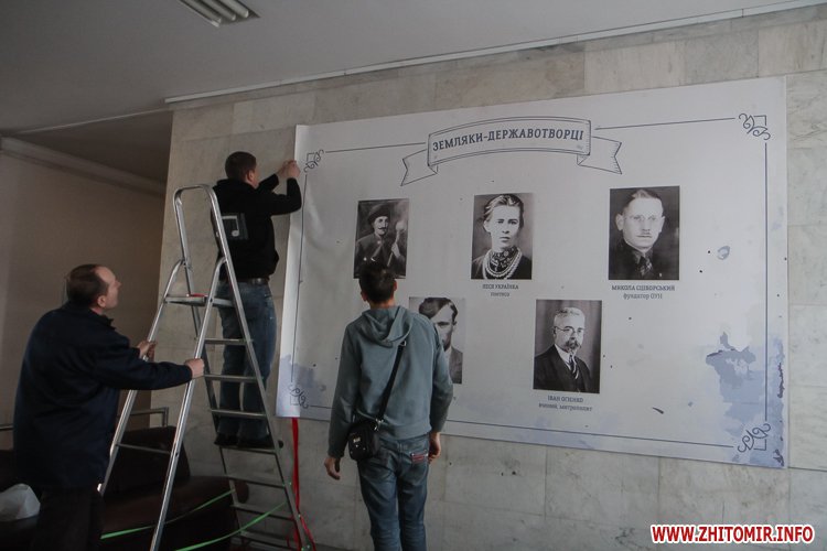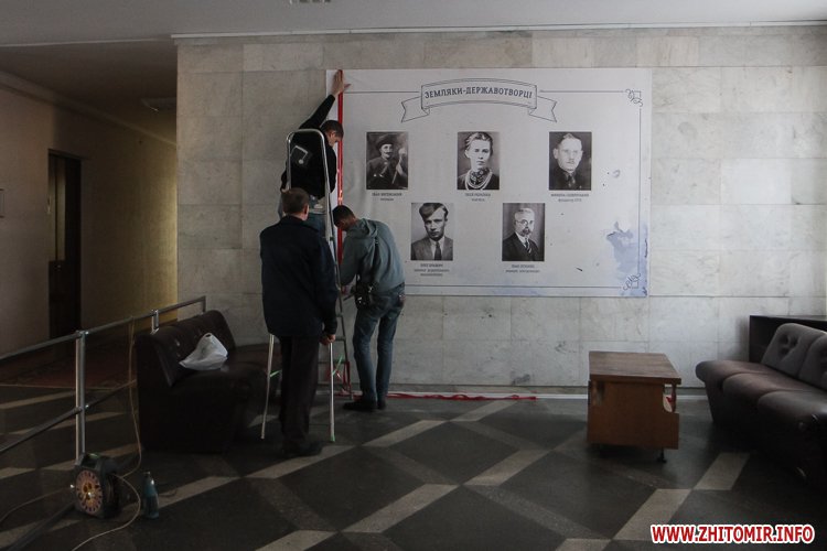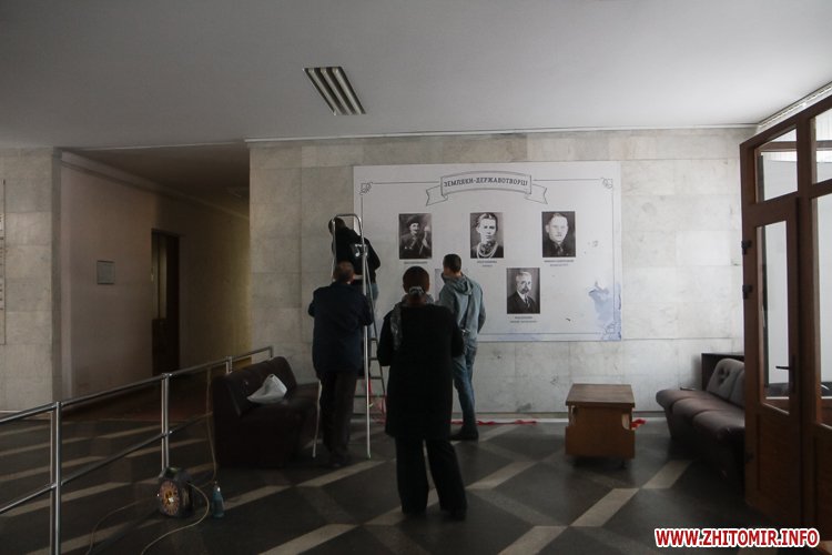 Працівники комунального підприємства обласної ради завішують банером спадщину радянських часів: висічену в мармурі інформацію про нагороди СРСР. Тепер працівників та відвідувачі адмінбудівлі зустрічатимуть портрети земляків-державотворців.
