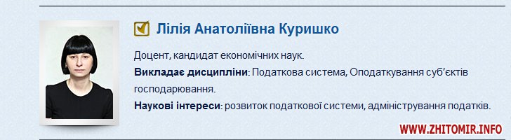 На сайті ЖДТУ є інформація, що кандидат економічних наук, доцент Лілія Анатоліївна Куришко – у складі викладачів кафедри фінансів і кредиту, викладає дисципліни «Податкова система» та «Оподаткування суб’єктів господарювання».