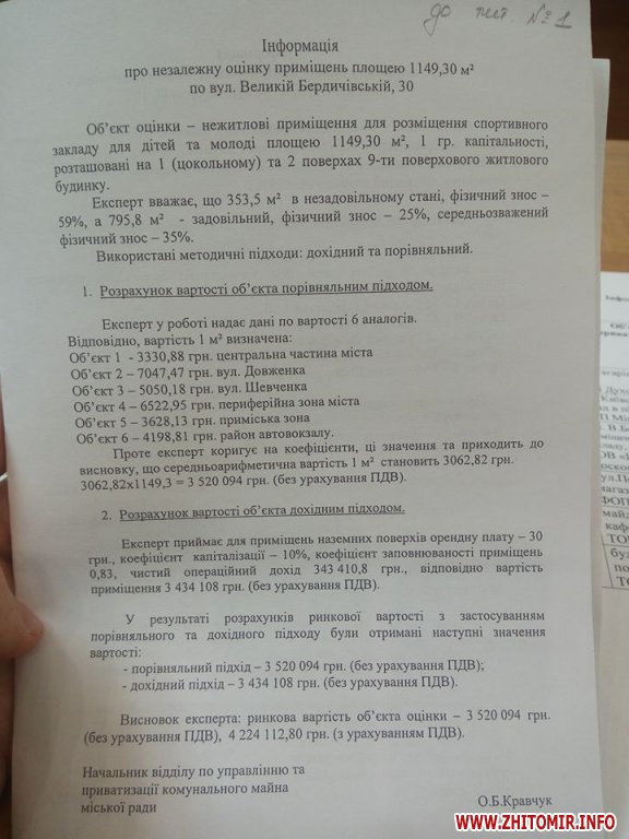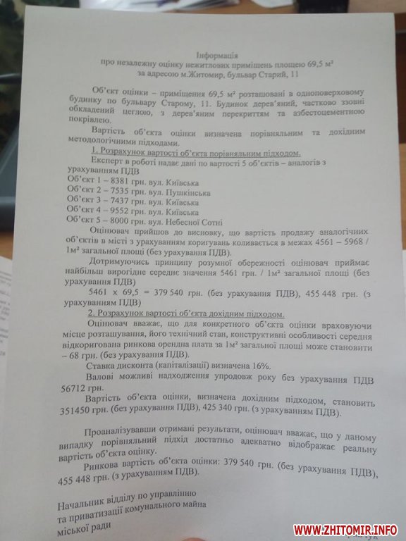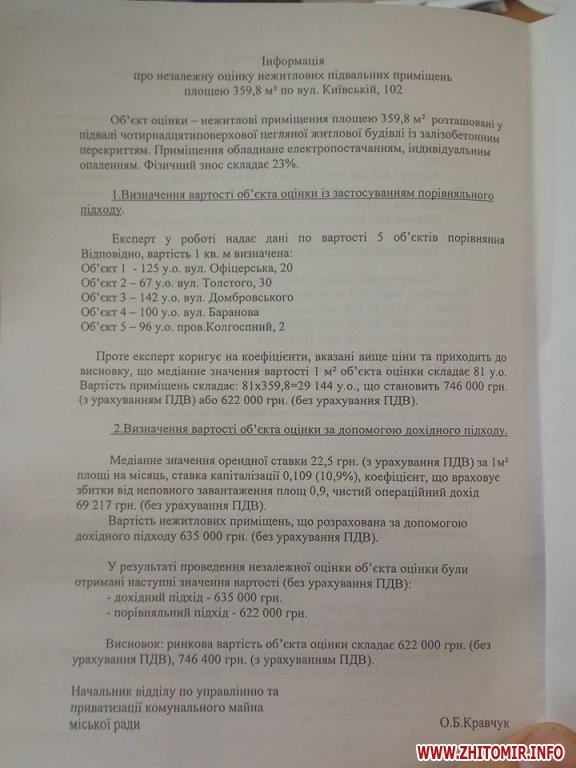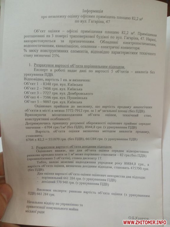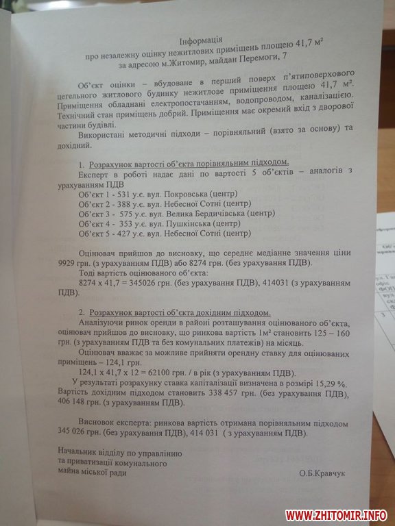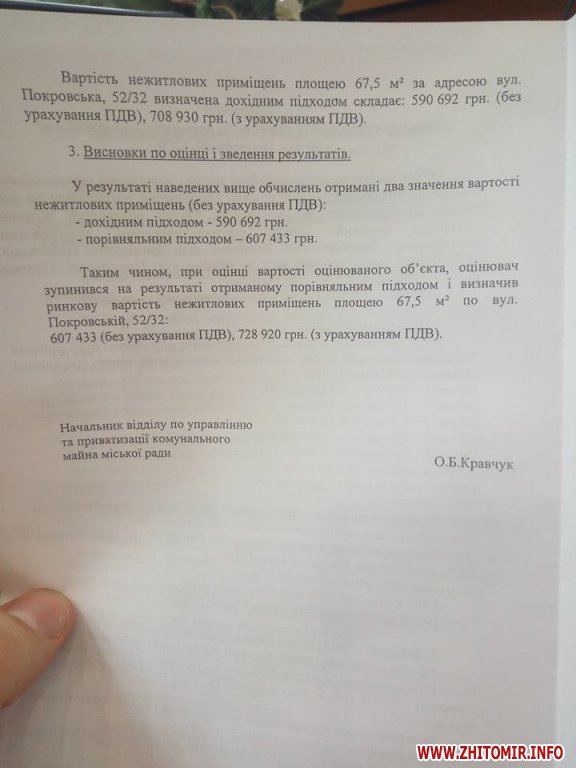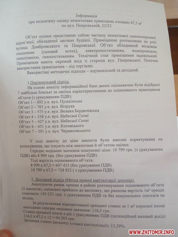 Як повідомляв Житомир.info, У переліку об’єктів на приватизацію, який був оприлюднений на початку березня 2016 року, було 40 адрес, в червні у переліку було вже 45 об’єктів. Голова бюджетної комісії Юрій Мойсеєв розповідав, як можна отримати право на викуп комунального приміщення через «поліпшення».