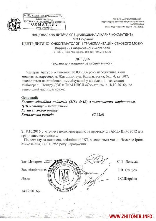 «У хлопчика страшний діагноз: «Гостра мієлоїдна лейкемія (М5а-ФАБ) з комплексним каріотипом. Група високого ризику. Комплексна ремісія». Наразі хлопчик лікується в лікарні "ОХМАТДИТ" і проходить четвертий курс хіміотерапії. Йому терміново потрібна пересадка кісткового мозку від нерідного донора, оскільки батьки та маленький 6-місячний братик не підходять. Є можливість отримати 5 курс хіміотерапії, здійснити пересадку кісткового мозку та пройти реабілітацію в Польщі. На даний час батьки хлопчика вичерпали всі можливі фінансові ресурси і потребують допомоги небайдужих людей, адже для спасіння життя дитини необхідно 112 тис. Євро!!! Така сума для простої родини є нереальною. На збір необхідних коштів залишився всього 1 місяць! Тому батьки просять всіх небайдужих відгукнутися на їх біду», - йдеться у дописі.
