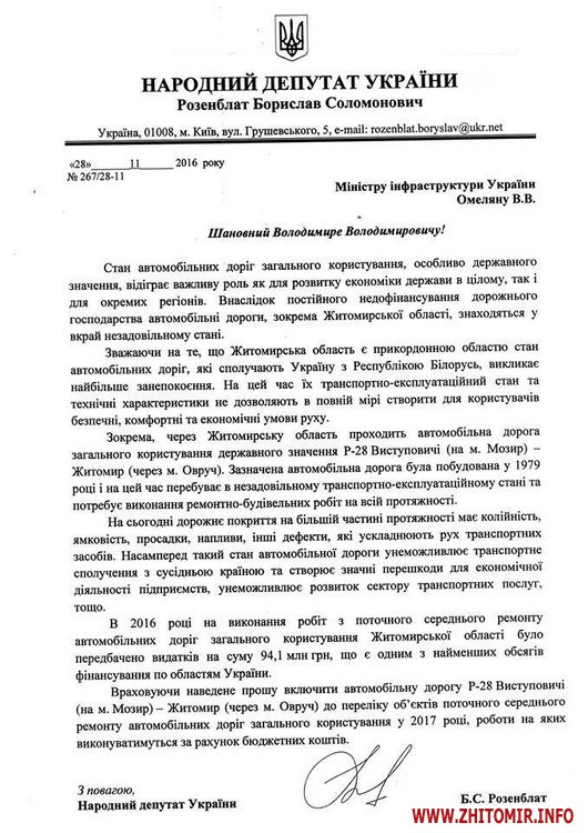 «Ще наприкінці минулого року ми підготували звернення від Житомирської ОДА на міністра інфраструктури Володимира Омеляна, потім я мав з ним особисту зустріч. Але, на жаль, тоді дороги Р-28 взагалі не було в планах на реконструкцію. Пріоритетним у цьому напрямку визначили автошлях через Чернігів. Проте, я продовжував переконувати, що ця дорога важлива! На початку року у Р-28 таки з’явилася у плані на ремонт, але всього лише 15.8 км (від Житомира до Черняхова)», – написав Борислав Розенблат.