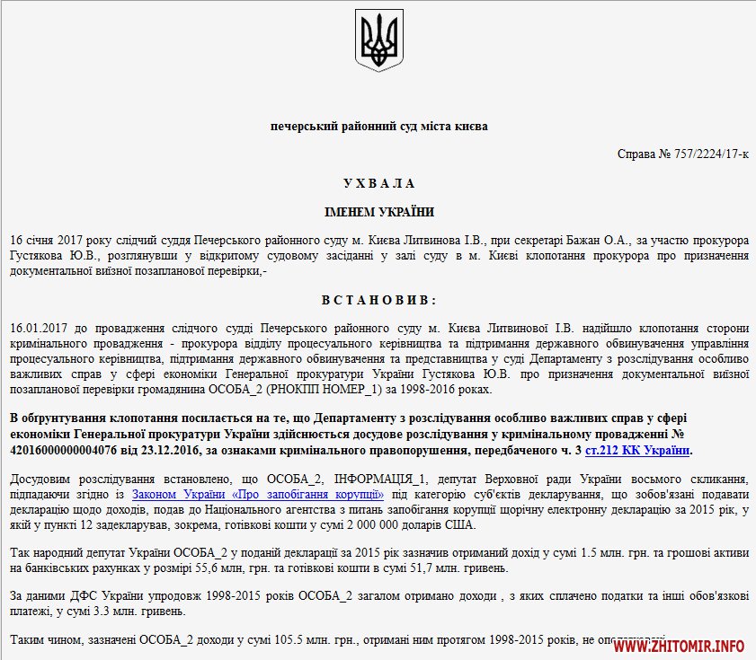 «Призначити позапланову документальну перевірку громадянина ОСОБА_2 (РНОКПП НОМЕР_1) з питань дотримання вимог податкового, валютного та іншого законодавства за період з 1998-2016рр. Проведення перевірки доручити співробітникам Державної фіскальної служби України. Ухвала не може бути оскаржена та підлягає негайному виконанню», - зазнається в рішенні Печерського райсуду