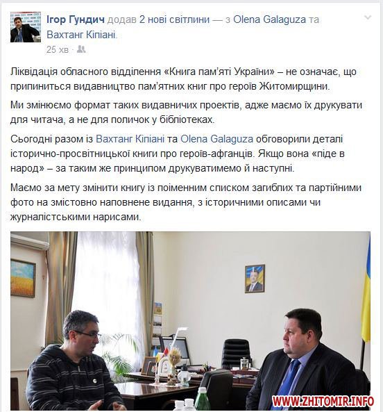 «Ліквідація обласного відділення «Книга пам’яті України» – не означає, що припиниться видавництво пам’ятних книг про героїв Житомирщини. Ми змінюємо формат таких видавничих проектів, адже маємо їх друкувати для читача, а не для поличок у бібліотеках. Сьогодні разом із Вахтангом Кіпіані та Оленою Галагузою (депутат Житомирської облради, – ред.) обговорили деталі історично-просвітницької книги про героїв-афганців. Якщо вона «піде в народ» – за таким же принципом друкуватимемо й наступні. Маємо за мету змінити книгу із поіменним списком загиблих і партійними фото на змістовно наповнене видання, з історичними описами чи журналістськими нарисами», – зазначив у дописі голова ОДА.