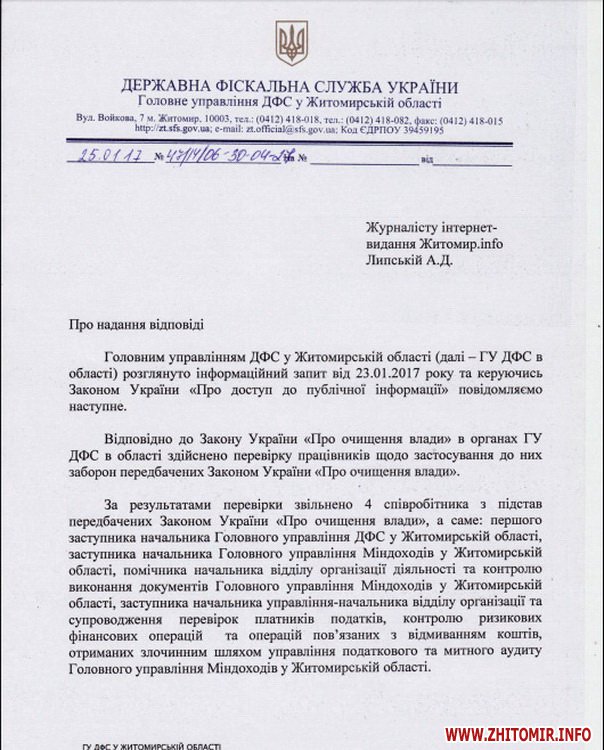 Про це йдеться у відповіді головного управління ДФС на інформаційний запит журналіста сайту Житомир.info.