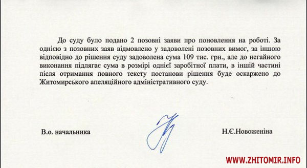 «Відповідно до Закону України «Про очищення влади», в органах ГУ ДФС в області здійснено перевірку працівників щодо застосування до них заборон, передбачених Законом України «Про очищення влади». За результатами перевірки звільнено 4 співробітника з підстав, передбачених Законом України «Про очищення влади», а саме: першого заступника начальника Головного управління ДФС у Житомирській області, заступника начальника Головного управління Міндоходів у Житомирській області, помічника начальника відділу організації діяльності та контролю виконання документів Головного управління Міндоходів у Житомирській області, заступника начальника управління – начальника відділу організації та супроводження перевірок платників податків, контролю ризикових фінансових операцій та операцій, пов’язаних з відмиванням коштів, отриманих злочинним шляхом, управління податкового та митного аудиту Головного управління Міндоходів у Житомирській області. До суду було подано 2 позовні заяви про поновлення на роботі. За однією з позовних заяв відмовлено у задоволенні позовних вимог, за іншою відповідно до рішення суду задоволена сума 109 тис. грн, але до негайного виконання підлягає сума в розмірі однієї заробітної плати, в іншій частині після отримання повного тексту постанови рішення буде оскаржено до Житомирського апеляційного адміністративного суду».