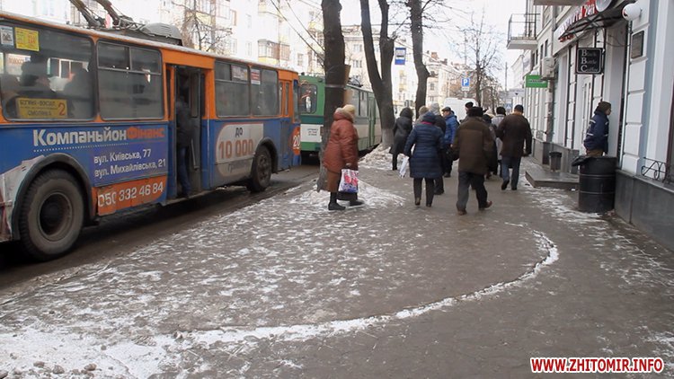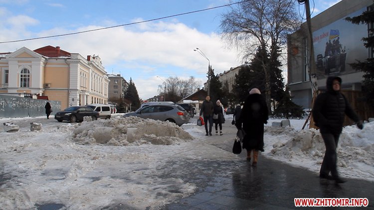 На тротуарах в Житомирі давно не асфальт, а кучугури снігу та лід. Ідучи містом, люди раз по раз підсковзуються, тому змушені рухатися обережно та повільно.