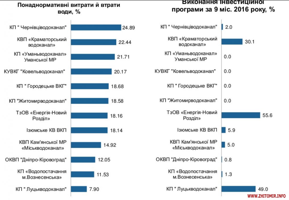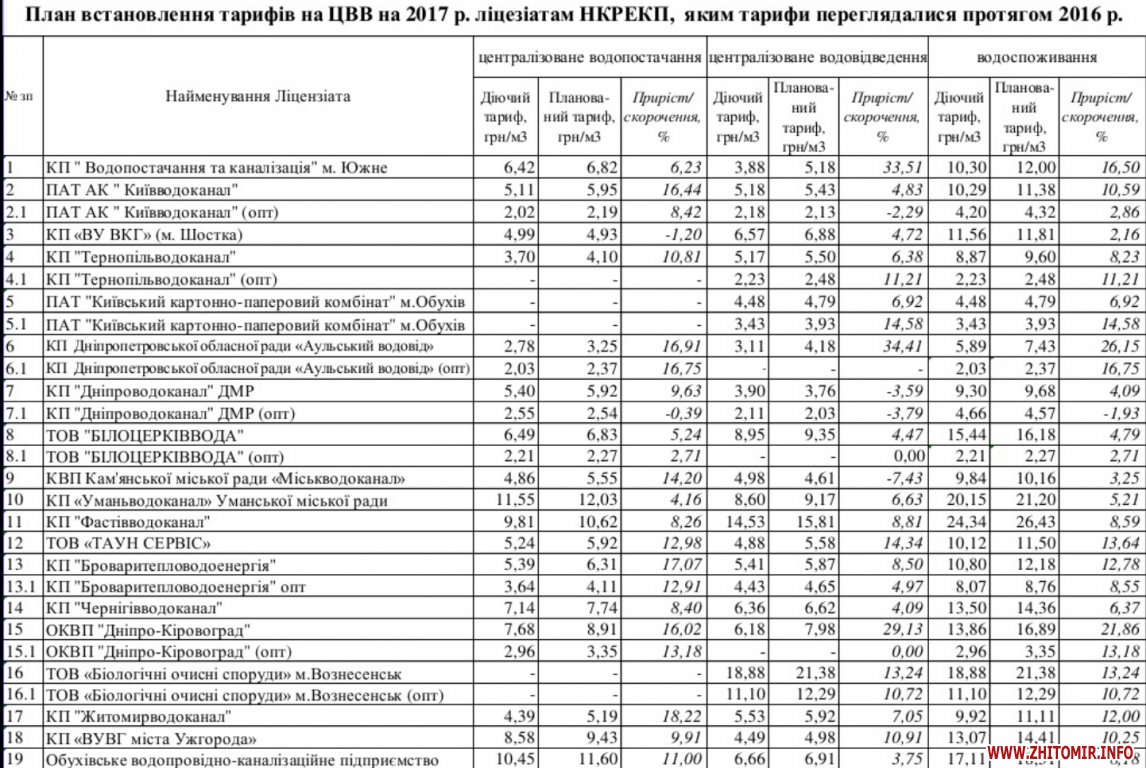 Відповідно до плану встановлення тарифів на 2017 рік, КП «Житомирводоканал» буде збільшувати тариф на 12% - з 9,92 грн до 11,11 грн за 1 куб.м, а саме: за централізоване водопостачання – з 4,39 грн/куб.м до 5,19 грн/куб. м (на 18,22%); за централізоване водовідведення – з 5,53 грн/куб.м до 5,92 грн/куб.м (7,05%). Якщо врахувати ПДВ, то за 1 куб.м води доведеться платити 13,33 грн.