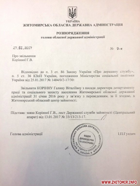 «Зокрема, із сьогоднішнього дня, 27 січня 2017 року, звільнено начальника управління екології та природних ресурсів Вадима Войцешука. Керівник області анонсував його звільнення вчора, під час спілкування із пресою. Також розпорядженням голови ОДА із 31 січня 2017 року буде звільнено директора департаменту праці та соціального захисту населення Галину Корінну. Відповідний документ Ігор Гундич підписав сьогодні», - інформує прес-служба.