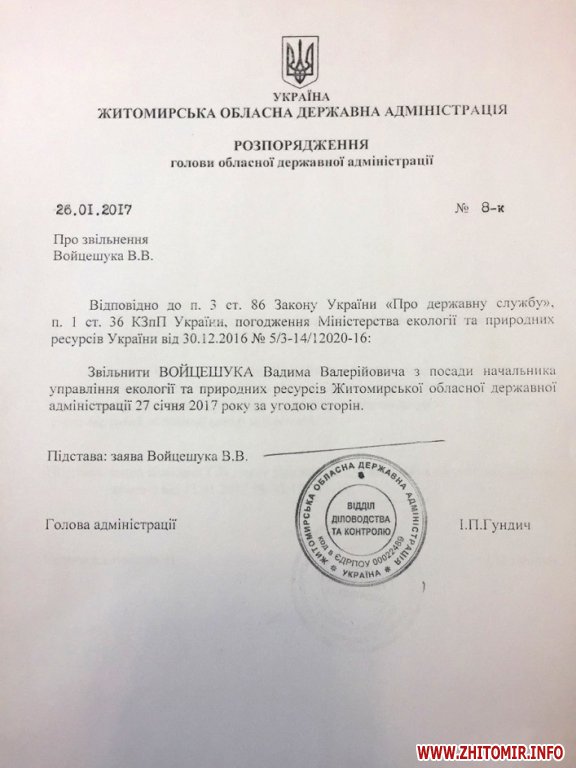 Як повідомляв Житомир.info, 26 січня Ігор Гундич анонсував звільнення начальника управління екології та природних ресурсів Вадима Войцешука, який попався на хабарі в 2500 доларів.