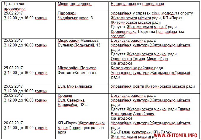 У Житомирі 25-26 лютого 2017 року збираються провести традиційні народні гуляння «На Масляну» на території парку культури та відпочинку ім. Ю. Гагаріна, гідропарку, мікрорайонів Маликова, Польовій, Крошні та вулиці Михайлівській.