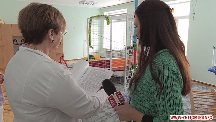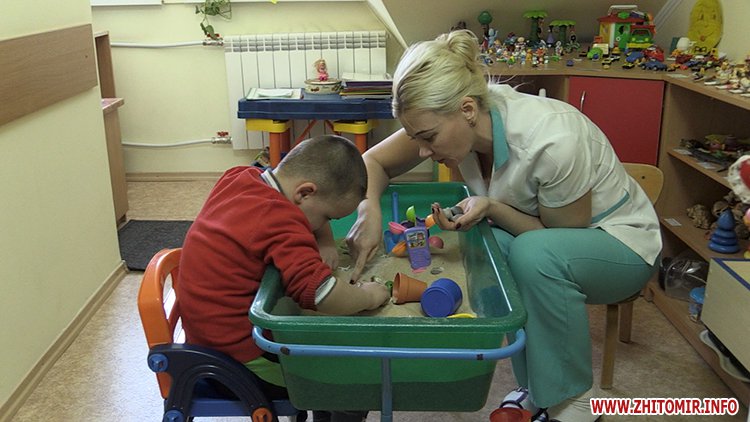 Вже сім років на базі Житомирського обласного спеціалізованого будинку для дітей у відділенні медико-соціальної реабілітації впроваджується пілотний проект МОЗ України, який дозволяє дітям із повних сімей, які мають відхилення у розвитку, амбулаторно лікуватися у відділенні разом із вихованцями дитячого будинку. Таким чином, з 2010 по 2016 рік пролікувалося понад дві тисячі дітей. До кожного, кажуть лікарі, обирають індивідуальний підхід: пісочна, музична та арт терапія, логопедичні та ортопедичні масажі, кінезотерапія. За комплексним лікування для свого сина, до центру, із Радомишля, приїхала і Олександра.