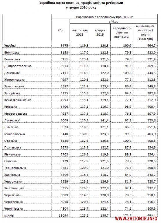 Середня заробітна плата в Житомирській області за рік зросла на 1700 грн і в грудні 2016 року становила 4997 грн, але це один з найгірших показників серед регіонів України.