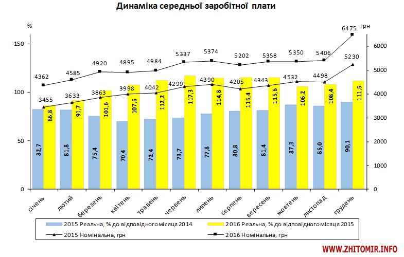«Середня номінальна заробітна плата штатного працівника підприємств, установ та організацій у грудні 2016р. становила 6475 грн, що в 4 рази вище рівня мінімальної заробітної плати (1600 грн). Порівняно із листопадом розмір заробітної плати збільшився на 19,8%, а за останні 12 місяців (відносно грудня 2015р.) – на 23,8%. Реальна заробітна плата у грудні 2016р. порівняно із листопадом збільшилася на 18,6%, відносно грудня 2015р. – на 11,6%», - повідомляє Держстат.