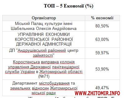 «У Житомирській області в 2016 році через систему електронних закупівель ProZorro у відсотковому відношенні найбільше було зекономлено Бердичівським міським палацом культури ім. Шабельльника О.А. (80,5%). Управління економіки Коростенської районної державної адміністрації змогло зекономити 63% від свого бюджету, Андрушівський районний центр зайнятості – близько 60%. На закупівлях для Коростенської виправної колонії було зекономлено 53,9%, а департамент містобудування та земельних відносин Житомирської міської ради зекономив майже 50%», – поінформувала прес-служба.