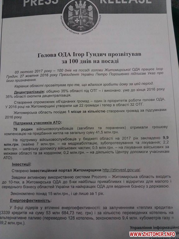 Прес-конференцію з тематичною назвою «100 днів від Указу» проводить 3 лютого голова Житомирської облдержадміністрації Ігор Гундич.