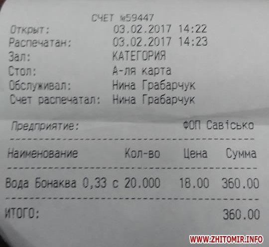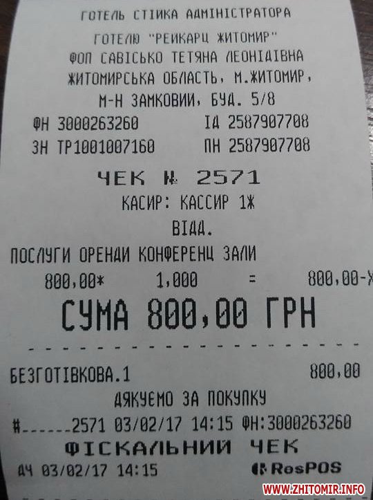 На підтвердження своїх слів вона надала Житомир.info чеки за оренду конференц-зали, оплату води та кави з тістечками, зазначивши, що кава оплачена ще 30 січня – при бронюванні зали. Проведення прес-конференції в готелі обійшлося в 2 тис. 360 грн.