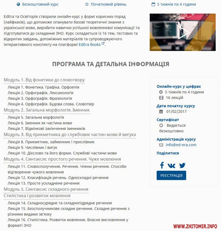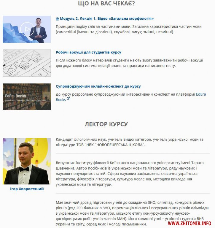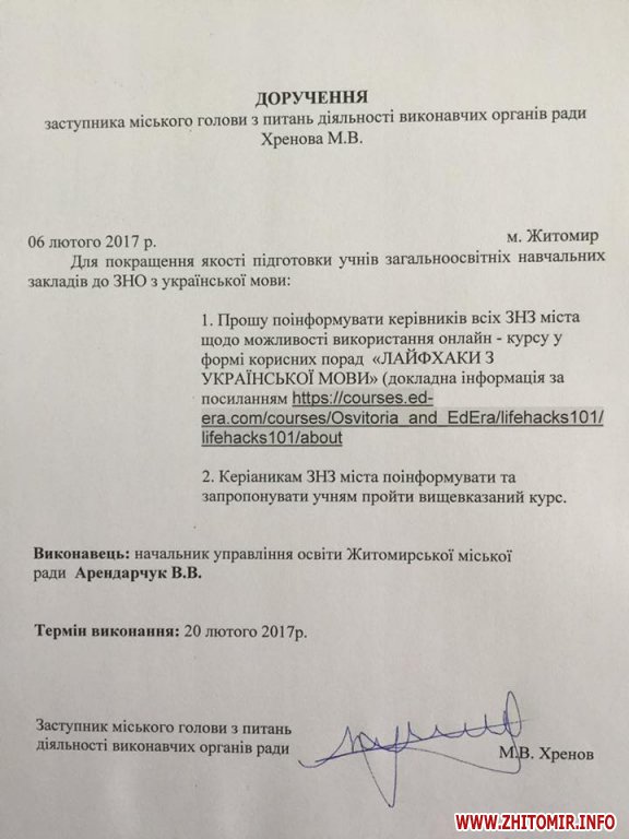 Заступник Житомирського міського голови Матвій Хренов 6 лютого підписав доручення, за яким керівники загальноосвітніх навчальних закладів міста мають запропонувати учням онлайн-курс «Лайфхаки з української мови» при підготовці до ЗНО.