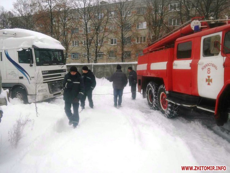 «6 лютого до служби порятунку «101» м. Коростень надійшло одразу два повідомлення з проханням допомогти відбуксирувати автомобілі зі снігових заметів. Зокрема, безпосередньо в районному центрі, на територію місцевого хлібзаводу, заїхала вантажівка DAF для розвантаження борошна. Після закінчення розвантажувальних робіт, автомобіль, виїжджаючи з території заводу, застряг у сніговому заметі. Після марних спроб водія самотужки вибратися зі снігової пастки, він викликав на поміч рятувальників. Бійці ДСНС за допомогою тросу на пожежному автомобілі ЗіЛ-131 відбуксирували застряглий транспортний засіб на дорогу, де водій зміг самостійно продовжити рух. Того ж дня, коростенські надзвичайники виїжджали на поміч водію вантажного автомобіля Volvo, що з’їхав у сніговий замет на 130-168 км автодороги Київ-Ковель. Через складні погодні умови на дорозі, водій, не впоравшись із керуванням, опинився на узбіччі. Крім того поблизу с. Яроповичі Андрушівського району тамтешні рятувальники вилучали зі снігового замету рейсовий автобус сполученням Житомир-Яроповичі. В салоні перебувало 4 пасажири. Ніхто з них в результаті пригоди не постраждав. Бійці ДСНС приєднали тросом автобус до пожежного автомобіля та допомогли вибратися зі снігової пастки», - йдеться у повідомленні.
