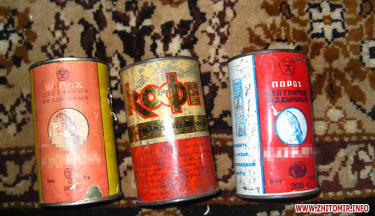 Тротилові шашки, порох, учбову гранату Ф-1 і різнокаліберні набої було виявлено правоохоронцями у ході огляду домоволодіння жителя м. Коростеня. Розпочато кримінальне провадження.