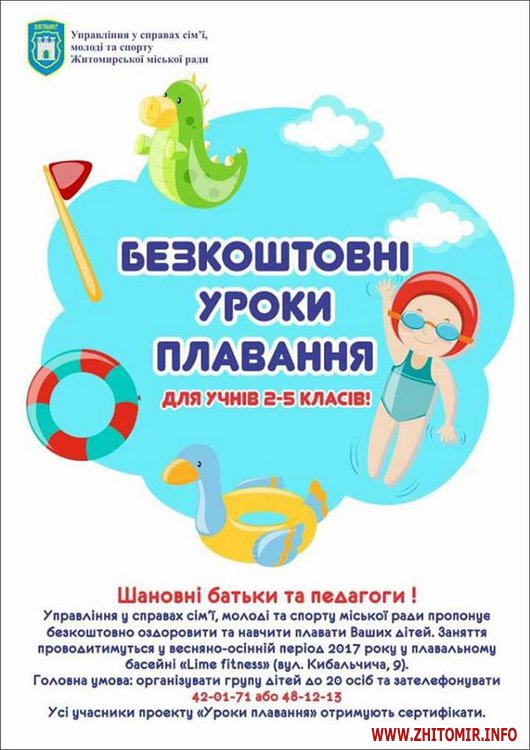 «Заняття проводитимуться у весняно-осінній період 2017 року в плавальному басейні «Lime fitness» по вул. Кибальчича, 9. Головна умова – організувати групу дітей до 20 осіб та зателефонувати за номером 42-01-71 або 48-12-13. Усі учасники проекту «Уроки плавання» отримають сертифікати», - йдеться в оголошенні.