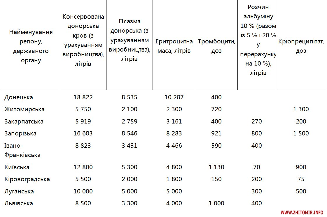 Розпорядженням Кабміну Житомирській області збільшили обсяги консервованої донорської крові до 5 750 літрів (у 2016 році було 4900 л) та еритроцитної маси – до 2300 л (у 2016 – 2190 л), водночас зменшений обсяг донорської плазми до 2100 л (у 2016 – 3700 л), кількість доз концентрату тромбоцитів – до 720 л (у 2016 – 1000 доз) та кріопреципітату – 1300 доз (у 2016 році – 1580 доз). Взагалі не запланована на цей рік розчин альбуміну (у 2016 році було 200 л).