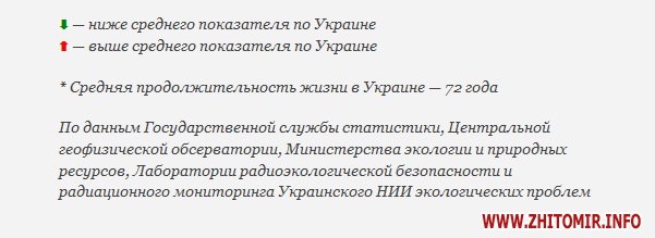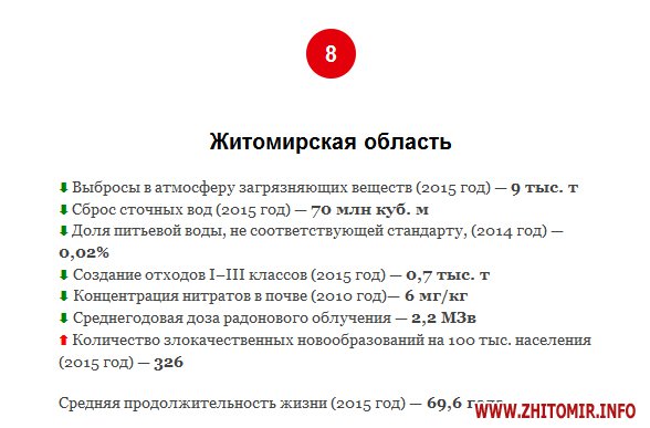 «На Житомирщине самая неблагополучная радиационная обстановка, если не считать зоны отчуждения в Киевской области. По данным Национальной комиссии по радиационной защите населения, зонами радиоактивного загрязнения в области считаются 145 населённых пунктов в 7 административных районах области: Емильчинском, Коростенском, Лугинском, Малинском, Народницком, Овручском, Олевском. Кроме того, в Чудновском районе есть радиоактивный могильник. Возможно, именно из-за повышенной радиации в Житомирской области самая низкая в Украине продолжительность жизни. Разрешение на выброс загрязняющих веществ в атмосферу имеет 2141 предприятие области. Основные загрязнители воздуха: Бердичевский газопровод, сбросивший в течение прошлого года 181 т оксида азота, овощной комбинат «Станишовка» и деревообрабатывающее предприятие «Вивад 09».