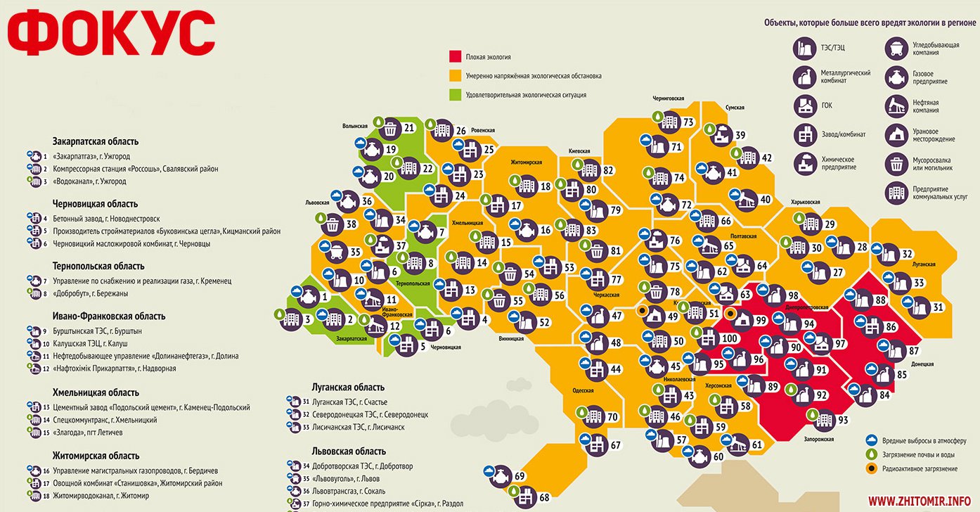 В конце 2016 году журнал «Фокус» составил экологический рейтинг областей, выяснив, в каких областях жить вредно для здоровья, а в каких экологическая ситуация удовлетворительна.