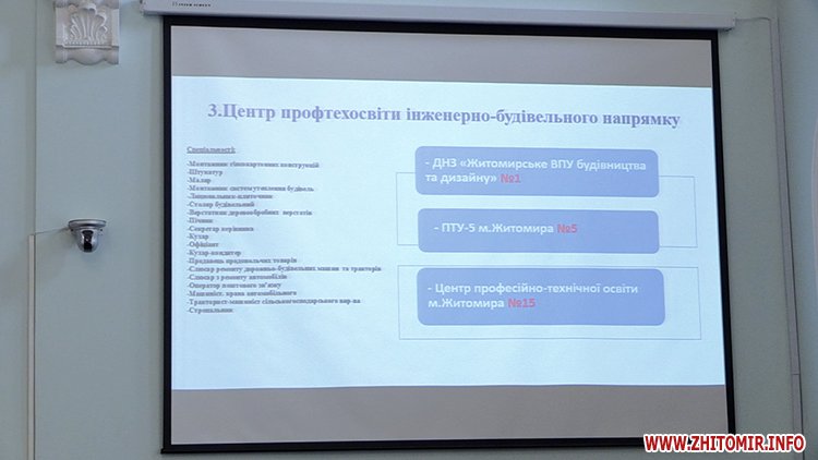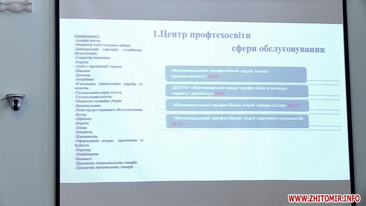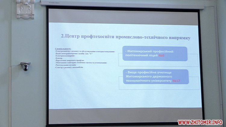 «Центр профтехосвіти складатиметься із чотирьох ПТУ: Житомирський професійний ліцей легкої промисловості, Житомирське вище професійне училище сервісу і дизайну, Житомирський професійний ліцей сфери послуг, Житомирський професійний ліцей харчових технологій. Тут перелік тих професій, які вони вивчають на сьогодні. Центр профтехосвіти промислово-технічного напрямку створюємо із двох ПТУ: Житомирський професійний політехнічний ліцей, Вище професійне училище Житомирського державного технологічного університету. Центр профтехосвіти інженерно-будівельного напрямку створюється на базі трьох ПТУ. Житомирське вище професійне технологічне училище №13 є найбільшим у Житомирі та самодостатнім, тому ми пропонуємо на його базі створити окремий центр багатопрофільної освіти», - розповідає заступник Житомирського міського голови Матвій Хренов.