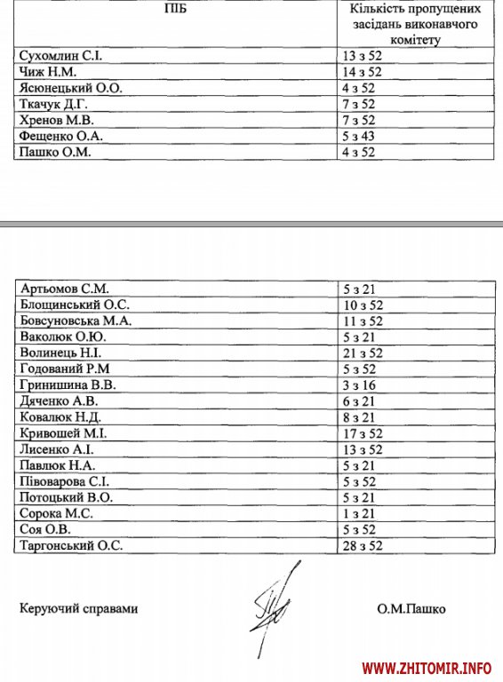 Члени виконавчого комітету Житомирської міської ради «прогулюють» засідання, деякі пропустили більше половини.