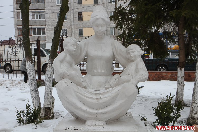 Пам'ятник Материнству. Скульптурна композиція, яка зображає матір з двома дітьми, розташована на території Перинатального центру у Житомирі.