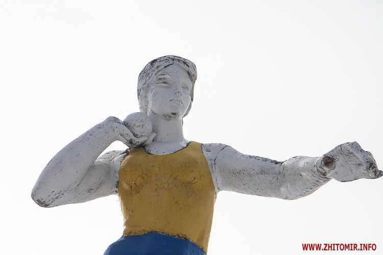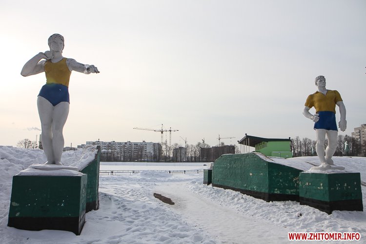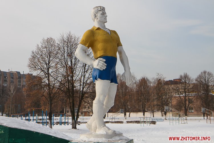 Охоронці стадіону. Дві велетенські скульптури спортсменів, розташовані обабіч входу на центральний стадіон Житомирського агроколеджу зображають легкоатлетку та футболіста.