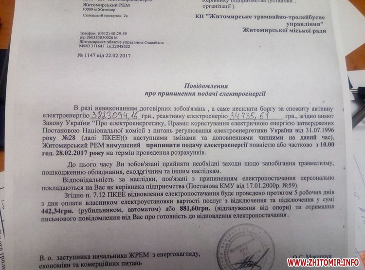 «В разі невиконання договірних зобов’язань, а саме несплати боргу за спожиту активну електроенергію 3823094,15 грн, реактивну електроенергію 34735,61 грн, згідно вимог Закону України «Про електроенергетику», Правил користування електричною енергією, затверджених Постановою Національної комісії з питань регулювання електроенергетики України від 31.07.1996 року № 28 (далі ПКЕЕ) (з наступними змінами та доповненнями чинними на даний час) Житомирський РЕМ вимушений припинити подачу електроенергії повністю або частково з 10:00 год. 28.02.2017 року на термін проведення розрахунків», – йдеться у листі.
