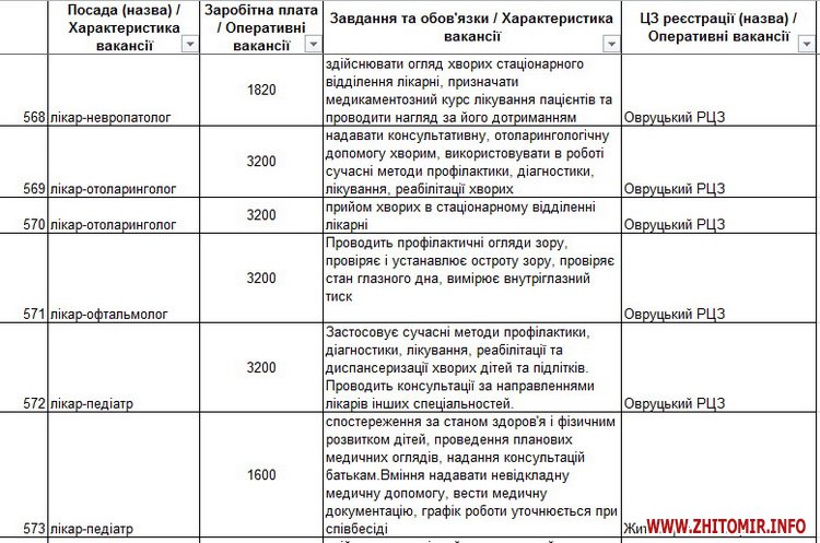 Лікарям в Овруцькому районі пропонують працювати за 985 гривень (акушер-гінеколог, обов’язки - проведення консультацій,профілактика ,діагностика та лікування гінекологічних захворювань пацієнтів лікарні), 1820 (невропатолог) та 1600 (педіатр, Житомир). Слідчим та оперуповноваженим пропонували зарплату у 8000 грн (конкурс закінчився 3 лютого 2017 року).