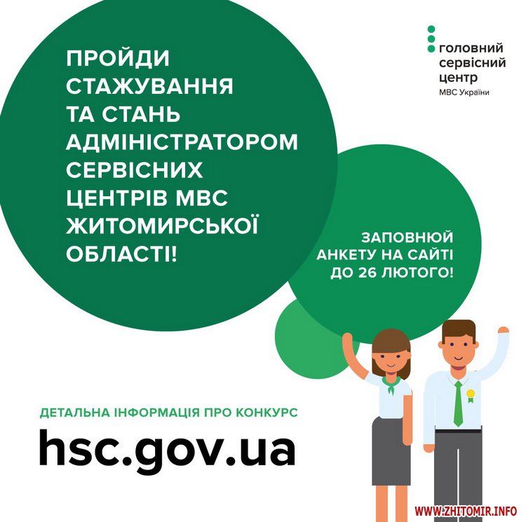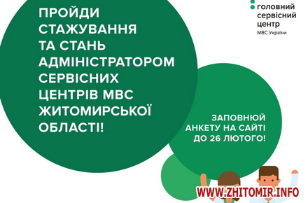 «З 17 лютого оголошено набір на стажування у сервісних центрах МВС у Житомирській області. Мета програми стажування – відібрати, навчити та в майбутньому прийняти на роботу найкращих стажерів – молодих і талановитих чоловіків та жінок, які мають активну життєву позицію та готові починати з себе зміни в країні. Під час навчання учасники отримають знання, потрібні для роботи співробітниками фронт-офісів сервісних центрів МВС», - йдеться у повідомленні.